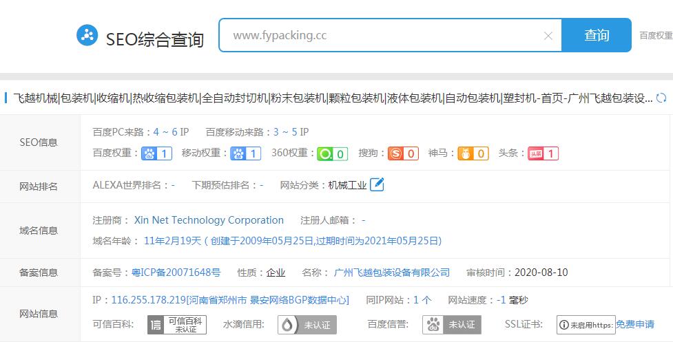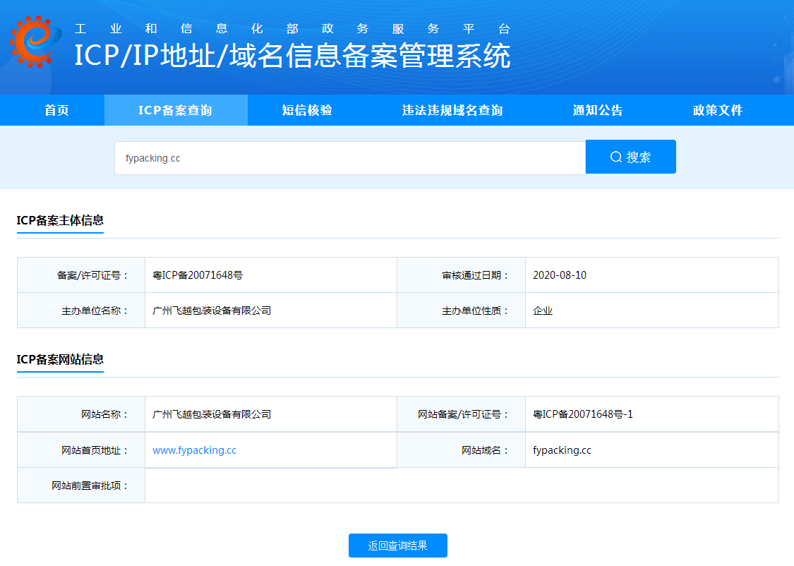 自2020年8月起,fypacking.cc域名,ICP備案主體信息的主辦單位名稱正式變更為新公司名“廣州飛越包裝設(shè)備有限公司”,ICP備案網(wǎng)站信息的網(wǎng)站名稱也變更為“廣州飛越包裝設(shè)備有限公司”,未變更前屬于“廣州市荔灣區(qū)飛越包裝機(jī)械廠”。