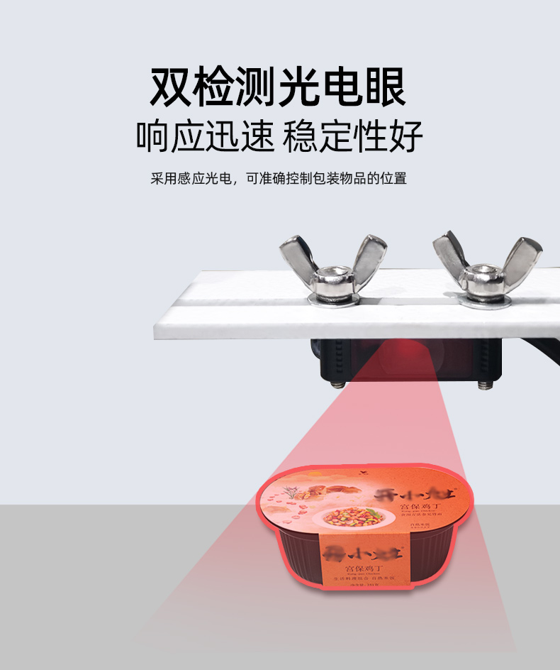 6、雙檢測光電眼,水平和垂直各1組,穩(wěn)定性好,相應(yīng)迅速,可以包裝很薄的產(chǎn)品