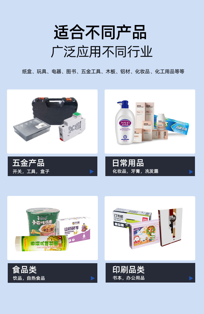 廣泛應(yīng)用于紙盒、玩具、電子、電器、文具、圖書、唱片、五金工具、地板、木板、建材、鋁材、日用品、藥品、飲料、化妝品、化工用品、工藝品、標(biāo)簽等商品的熱收縮包裝。