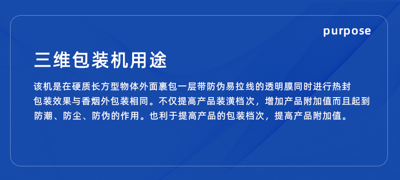 全自動三維包裝機主要用于紙盒商品的外包裝,廣泛適用于藥品、煙草、日用品、避孕套(安全套)、保健品、食品、化妝品、音像制品、文具用品(如橡皮擦、告示貼等)等行業(yè)中的各種單件小盒式物品的透明膜三維貼體包裝,如避孕套(安全套)、盒裝藥品、撲克、便簽紙、磁帶、DVD、VCD等商品的自動包裝。