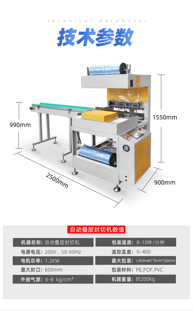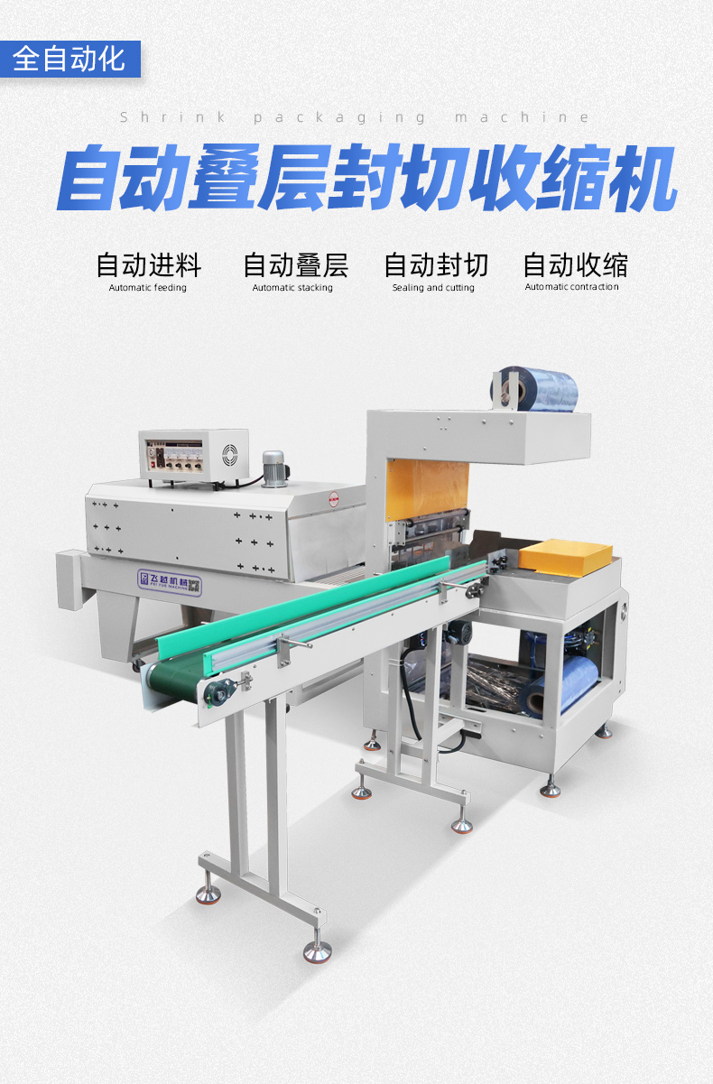 袖口套膜封切機(jī)(疊層),屬于套膜封切機(jī)的一種,可定做包裝1層產(chǎn)品,也可定做疊加包裝1-3層產(chǎn)品,減少人工,降低勞動成本,提高生產(chǎn)效率。疊層袖口封切機(jī)以PVC熱收縮膜為包裝材料,對商品進(jìn)行自動疊層(1-3層)、套膜封切并輸送到收縮機(jī)進(jìn)行熱收縮以使商品收縮良好,是目前先進(jìn)的套膜封切機(jī)。