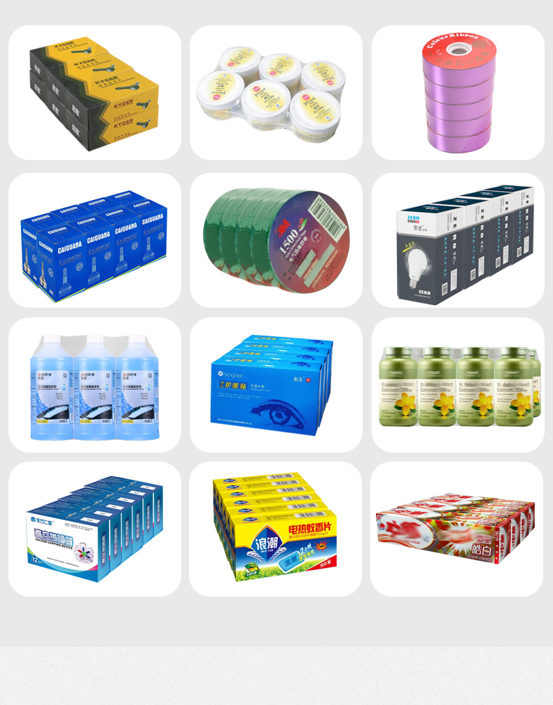特別適合包裝透明膠帶、布基膠帶、牛皮紙膠帶、不干膠標(biāo)簽等多個(gè)組合包裝,以及各類小盒的單個(gè)或者多個(gè)組合包裝,有無底托均可,包裝過程中具有自動排列、堆垛等功能,提高生產(chǎn)效率,包裝后的產(chǎn)品外觀整潔、緊湊不散、方便裝箱運(yùn)輸,還可應(yīng)用于紙箱、啤酒、飲料、礦泉水、可口可樂、易拉罐、建材、鋁材、木地板等單個(gè)大件商品或多個(gè)小件組合商品有底托或無底托的熱收縮包裝。