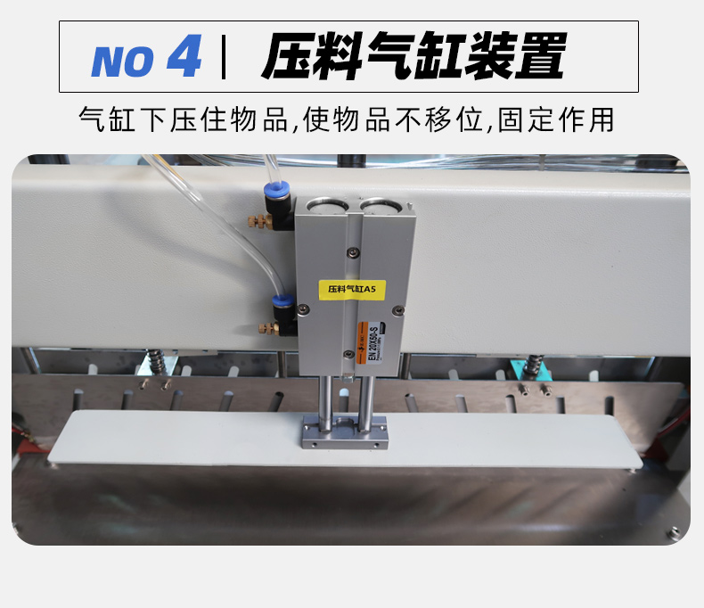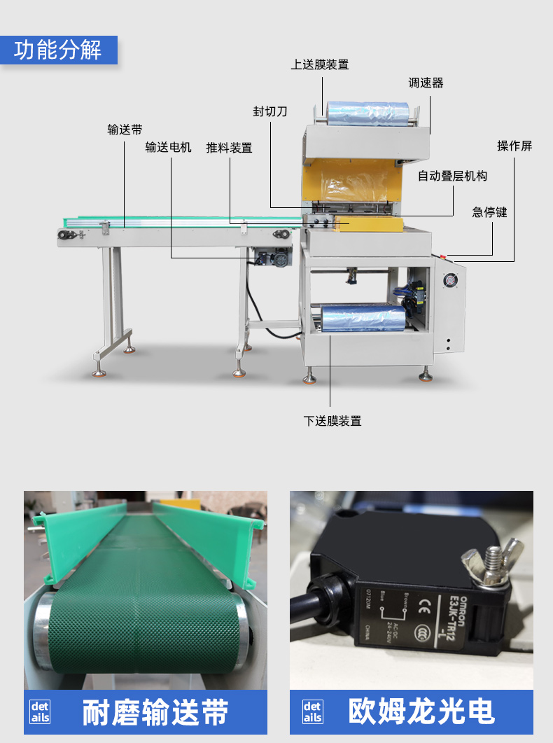 5、自動送料裝置,把產(chǎn)品放到輸送帶,自動送料進(jìn)行疊層、套膜封切并輸送到熱收縮機(jī)