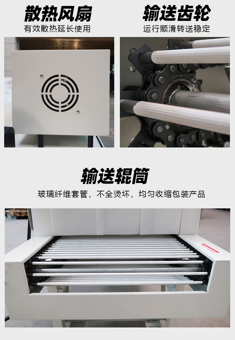 5、輸送輥筒隨著輸送帶運(yùn)行而勻速、不間斷滾動,解決底部難收縮的困擾