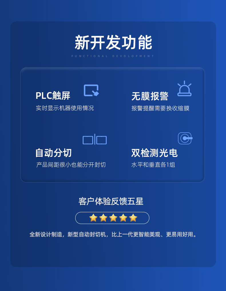 ①使用PLC觸摸屏控制,一學(xué)就會,全新設(shè)計并簡化控制線路,方便維護(hù),穩(wěn)定性好;②產(chǎn)品自動分切,哪怕2個相距2cm的產(chǎn)品也能自動分開封切,不會誤切,產(chǎn)品間距很小,大大縮短輸送距離,提高生產(chǎn)效率;③特氟龍涂層鋁合金封切刀,耐用不粘膜,耐高溫不易變形,封口線牢固不開裂,封切不焦化冒煙,好刀是好包裝的前提,封口好,包裝效果才好;④升級雙檢測光電眼,水平光電和垂直光電各1組,可以包裝很薄的產(chǎn)品,擴(kuò)大了包裝范圍,代替單檢測光電;⑤針輪位置可調(diào),大大方便了包裝多種規(guī)格的產(chǎn)品需要調(diào)節(jié)針孔排氣的情況,只需5秒,免拆卸調(diào)節(jié)針輪位置,舊款要松螺絲拆卸調(diào)節(jié)針輪位置,費時又不便;⑥產(chǎn)品誤切保護(hù),專為安全設(shè)計,安全是好機(jī)器必不可少的,當(dāng)封切刀碰到產(chǎn)品立即停止封切自動彈起,防止誤切,保護(hù)切刀、產(chǎn)品和人;