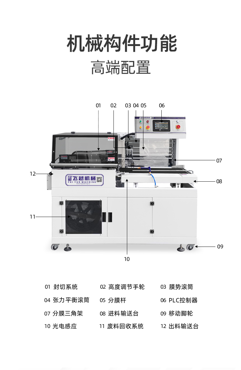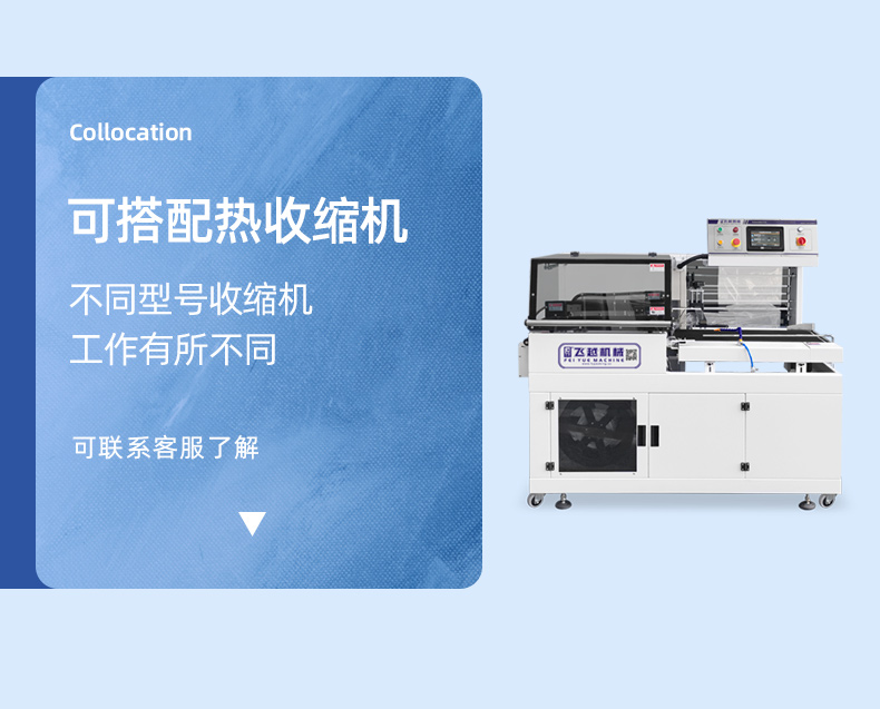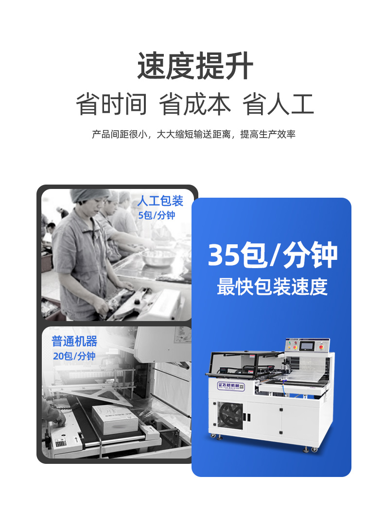 10、自動送料裝置,放到輸送帶的產(chǎn)品,自動進(jìn)行套膜封切,并輸出到收縮機(jī)