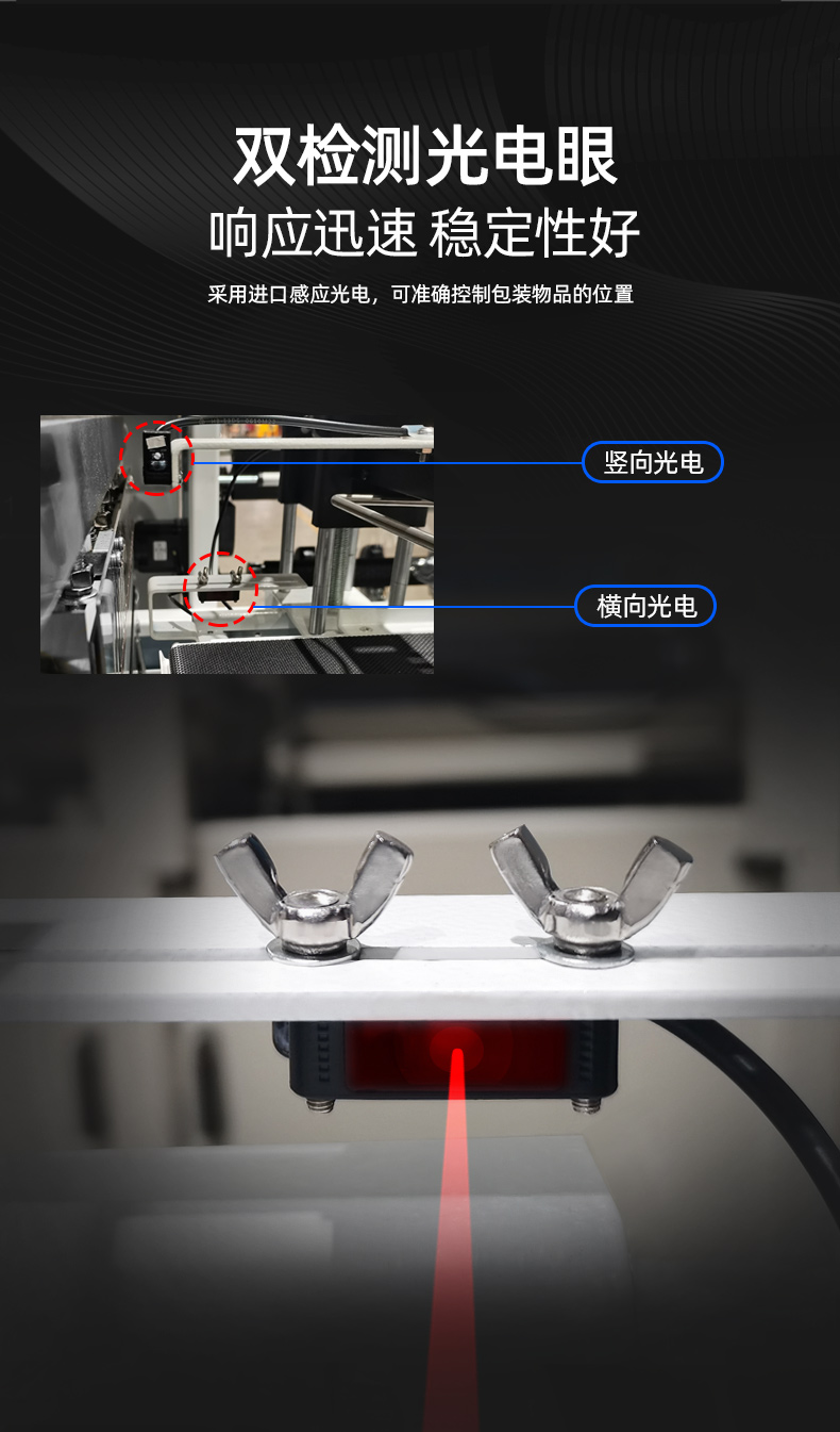 6、雙檢測光電眼,水平和垂直各1組,穩(wěn)定性好,響應(yīng)迅速,可以包裝很薄的產(chǎn)品