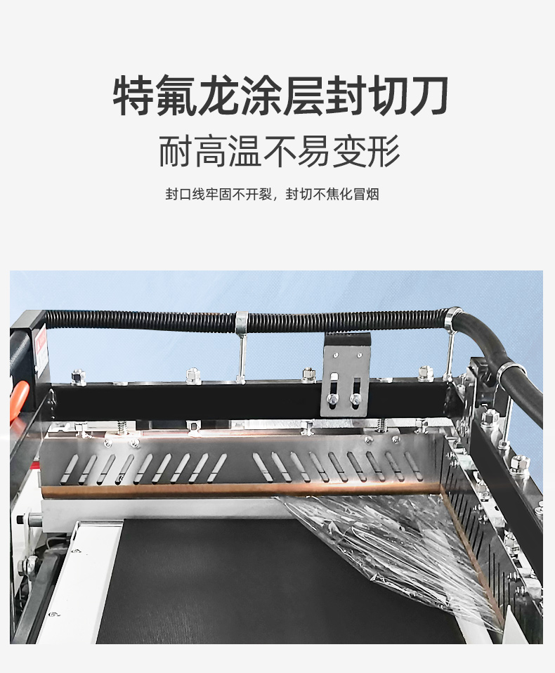 4、鋁合金封切刀,特氟龍涂層不粘膜,耐高溫不易變形,封口線牢固不開裂,封切不焦化冒煙