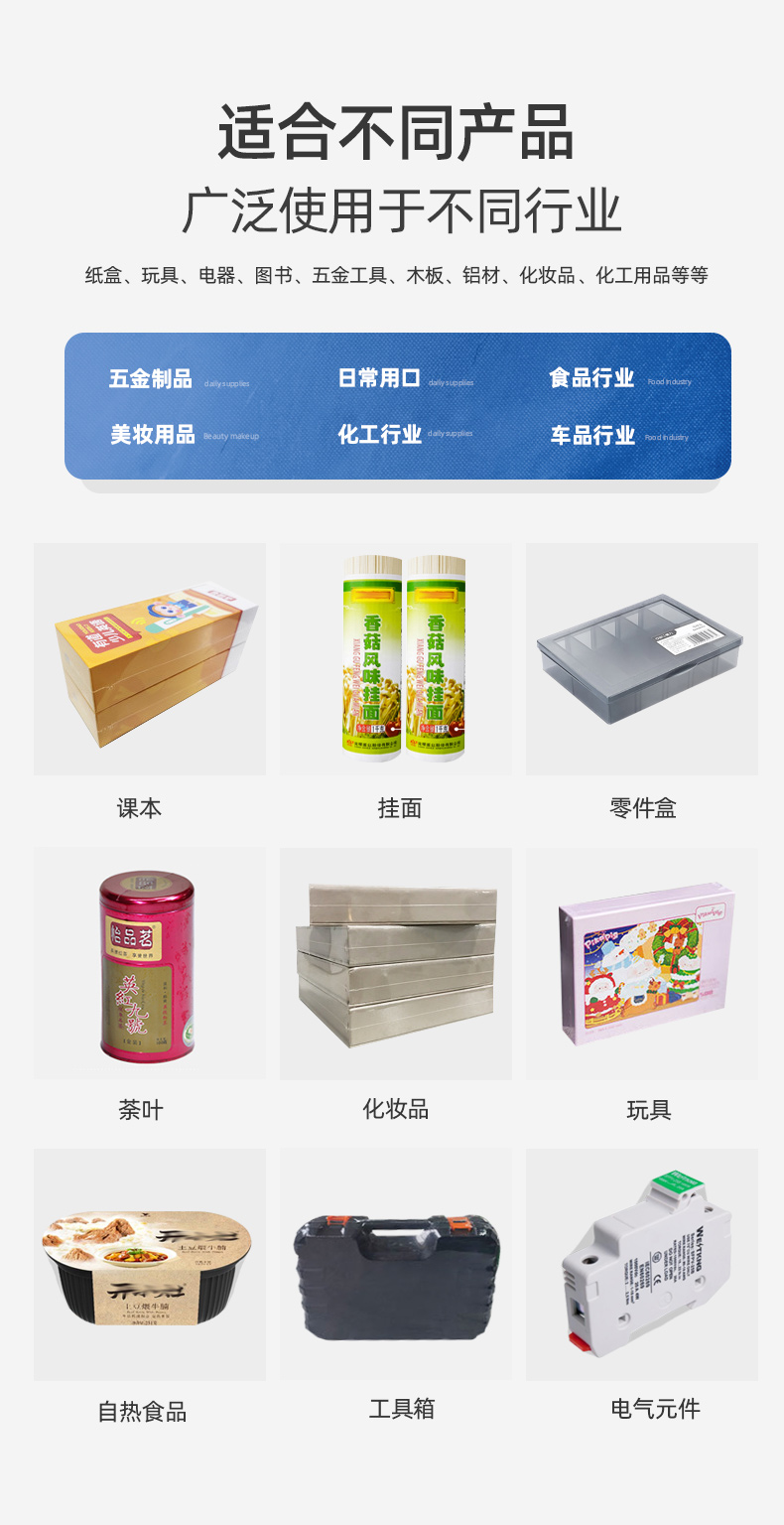 廣泛應(yīng)用于紙盒、玩具、電子、電器、文具、圖書、唱片、五金工具、地板、木板、建材、鋁材、日用品、藥品、飲料、化妝品、化工用品、工藝品、標(biāo)簽等商品的熱收縮包裝。