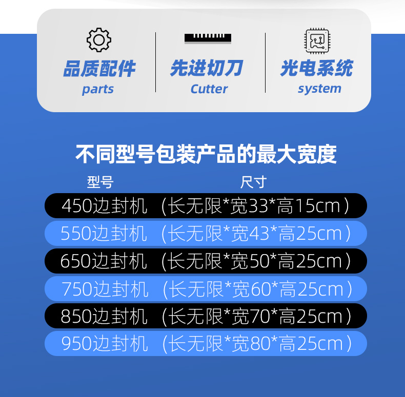 注:封口線長寬不等于包裝尺寸;速度與產(chǎn)品尺寸有關(guān);人工測量存在誤差;重量和尺寸僅供參考,以實(shí)際為準(zhǔn);封切機(jī)可根據(jù)小商品定制密接;邊封機(jī)常規(guī)高度為150mm,可定制加高250mm。本套機(jī)器不帶空壓機(jī),需另行選購!
