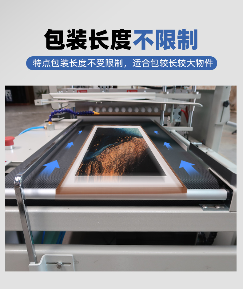 7、自動送料裝置,把包裝物放到輸送帶,機(jī)器自動送料進(jìn)行套膜封切,然后輸送到收縮機(jī)