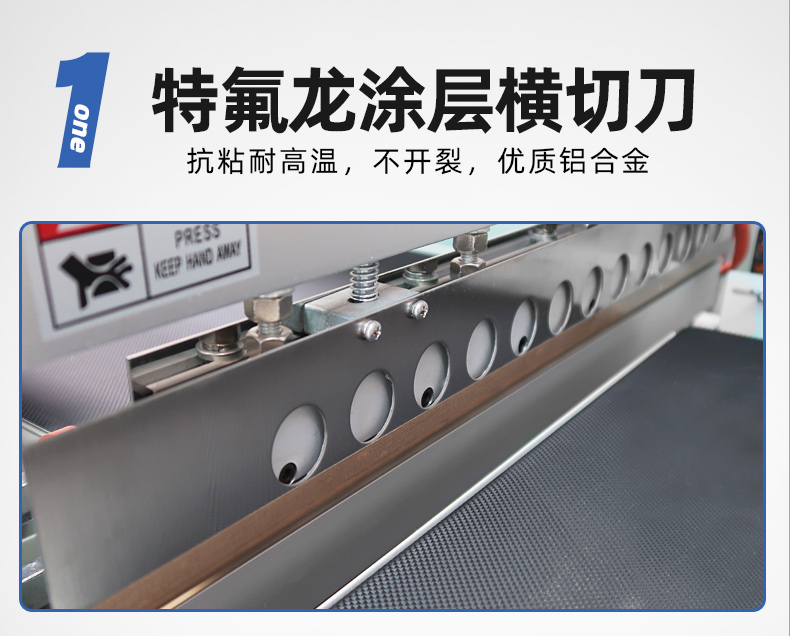 2、特氟龍涂層鋁合金封切刀,抗粘刀耐高溫、封口線牢固不開裂、封切不焦化冒煙,封切刀護(hù)板采用優(yōu)質(zhì)合金鋼不易變形