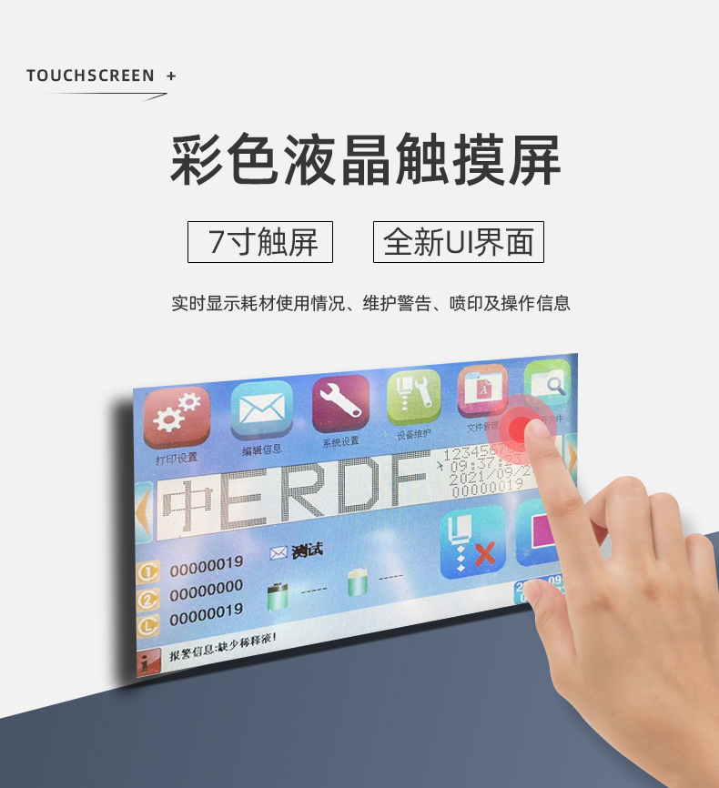 采用7英寸彩色液晶觸摸屏,實(shí)時顯示耗材使用情況、維護(hù)警告、噴印及操作信息等。