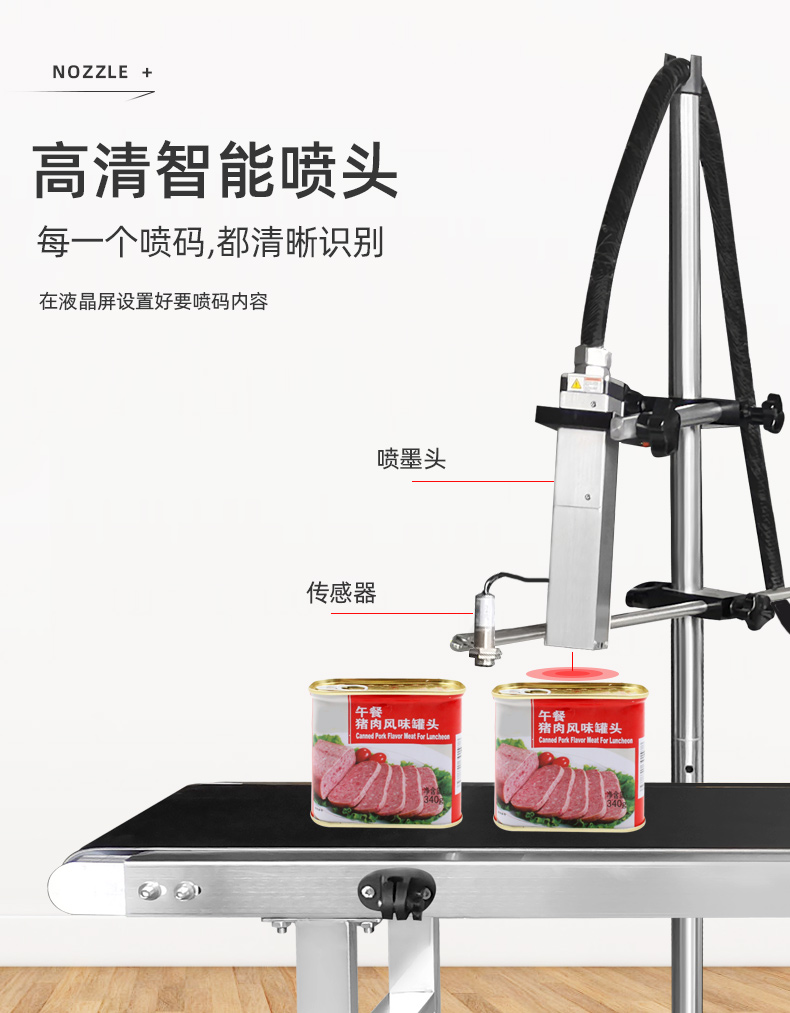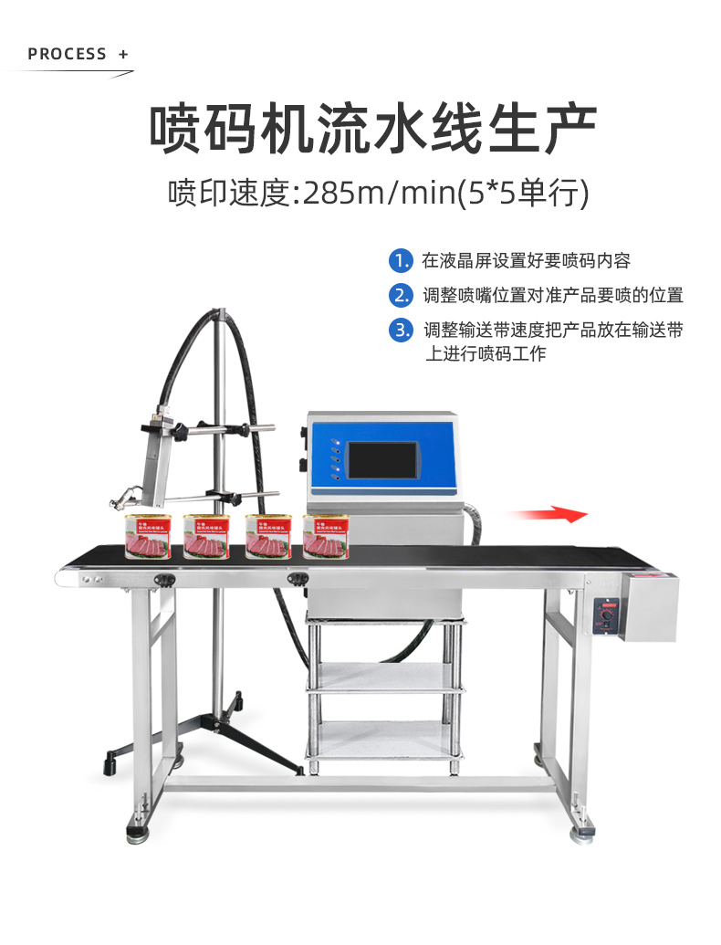 主要用于輸送玻璃瓶、塑料瓶、金屬、塑料袋、紙袋、紙箱、標簽等、便于噴碼機或者激光機進行噴碼,噴印生產(chǎn)日期、批號防偽標記、圖案等。